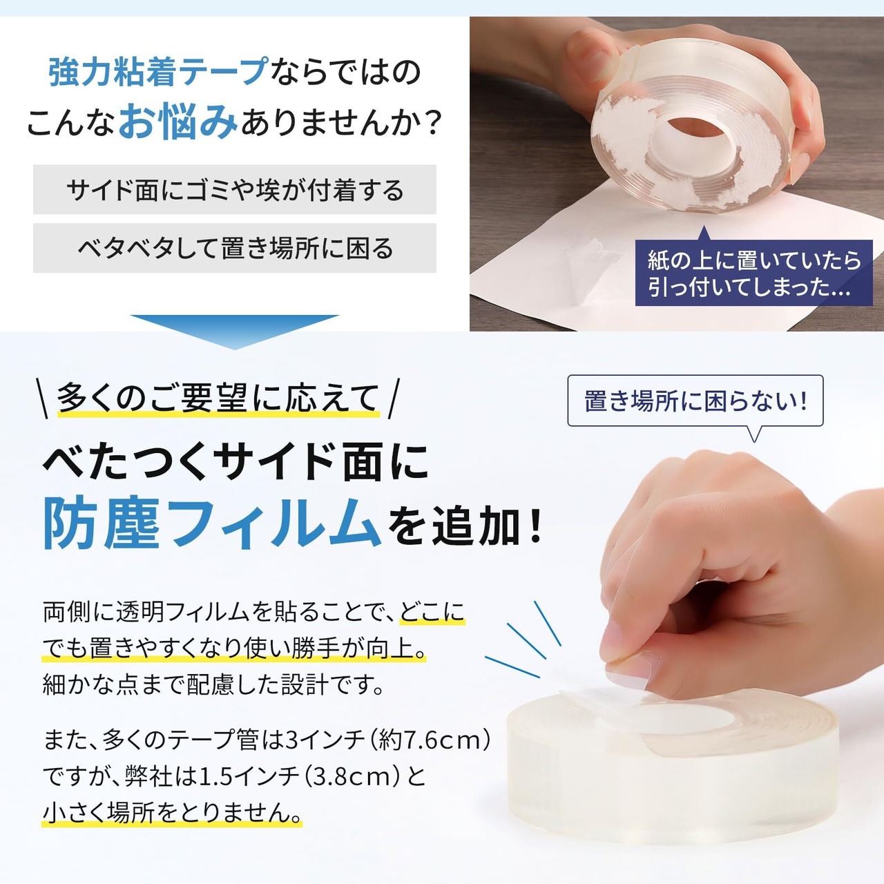 【貼りたい場所に困らない工夫】両サイドに防塵フィルム付きだから、使うまでペタペタしない!サイドにゴミがつかず、保管も快適。芯の直径もコンパクト設計で、省スペースに収まりやすいのもうれしい。使いやすさへのこだわりが詰まった一本!