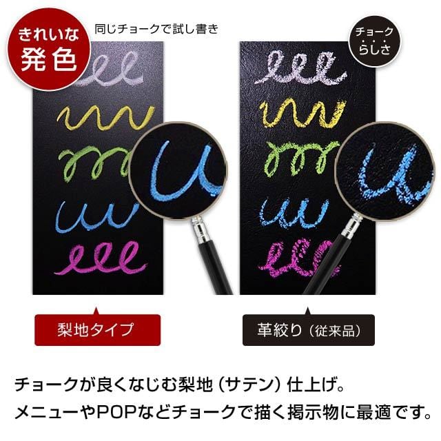 梨地タイプは表面処理がデリケートです。力任せに擦りつけるように描くとシート表面が傷つく場合があります。また、ボードマーカーなどのインクがシート表面でやや膨らむ傾向があります。お子さまのお絵かきや、ブラックボードマーカーでの掲示物などには「大きな黒板シート」(革絞りタイプ)をおすすめします。